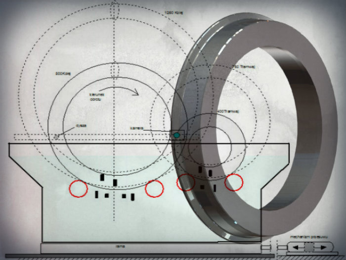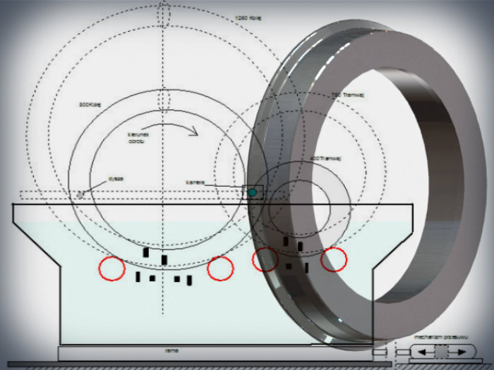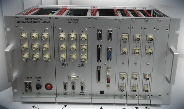 Projekt zrealizowany w 2009 r w Hucie Bankowej w Dąbrowie Górniczej. Stanowisko diagnostyczne przeznaczone do wielokanałowej inspekcji w ciągu linii produkcyjnej obręczy kolejowych.
