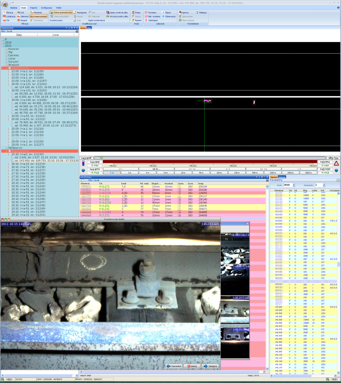 System defektoskopowy jest sprzężony z systemem wizyjnej inspekcji szyn, obejmującym cztery kamery wysokiej rozdzielczości ze sprzęgiem cyfrowym oraz dwa serwery wizyjne, rejestrujące strumienie wideo z kamer obserwujących szyny i udostępniające je później oprogramowaniu edycyjnemu. Rejestracja wyników pomiarów ultradźwiękowych oraz obrazów wideo jest zsynchronizowana za pomocą sprzętowego licznika drogi.